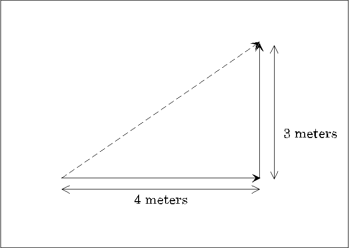 We can see that if the ball's uniform motion is compounded of a steady velocity of 4 meters per second parallel to the length of the table and a steady velocity of 3 meters per second parallel to the width, as shown above, the actual distance the ball moves in one second is 5 meters (remembering Pythagoras' theorem, and in particular that a right angled triangle with the two shorter sides 3 and 4 has the longest side 5---we chose these numbers to make it easy). That is to say, the speed of the ball is 5 meters per second.