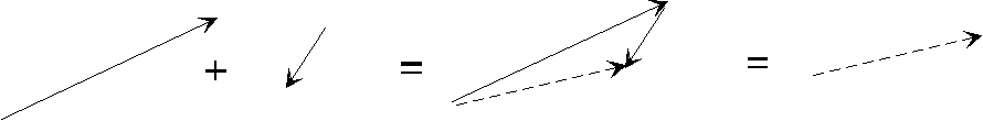 So in the diagram above, the two vectors on the left add to give the vector on the right. (We are just using a dashed line for one of them so you can see what's going on in the middle, usually all vectors are represented by solid lines.) To get a bit less abstract, this could represent relative velocity in the following way: the big arrow on the left might be the speed at which a person is swimming relative to water in a river, the little arrow is the velocity at which the river water is moving over the river bed. then the vector sum of these two represents the velocity of our swimmer relative to the river bed, which is what counts for actually getting somewhere!